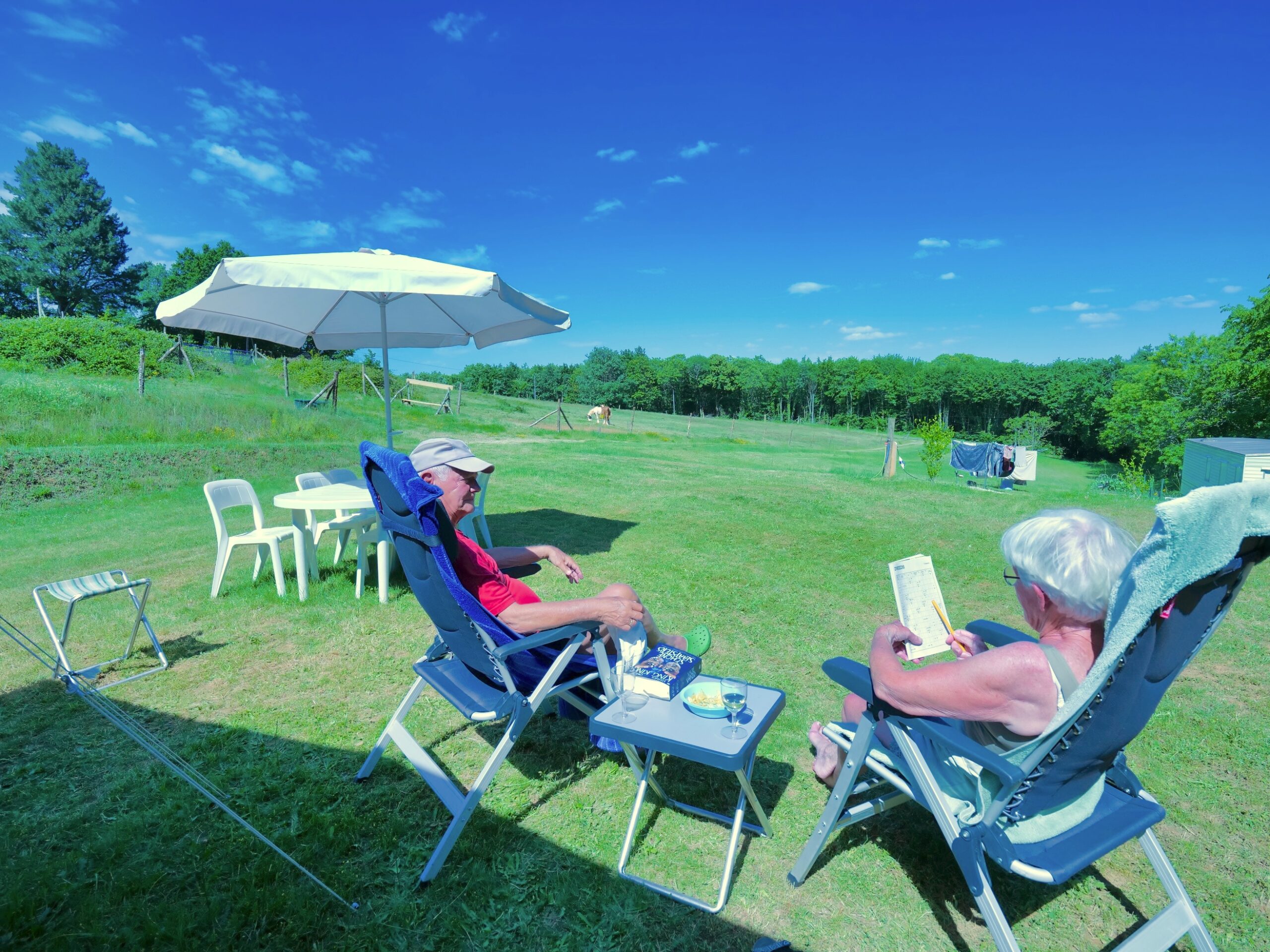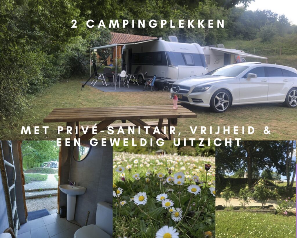 Helemaal bovenin ons park, met uitzicht over het bos en de velden, vindt u onze campingplaatsen. Het veld is groot, maar wij hebben besloten om maximaal twee plekken te verhuren aan mensen die ons willen bezoeken met camper of tent.