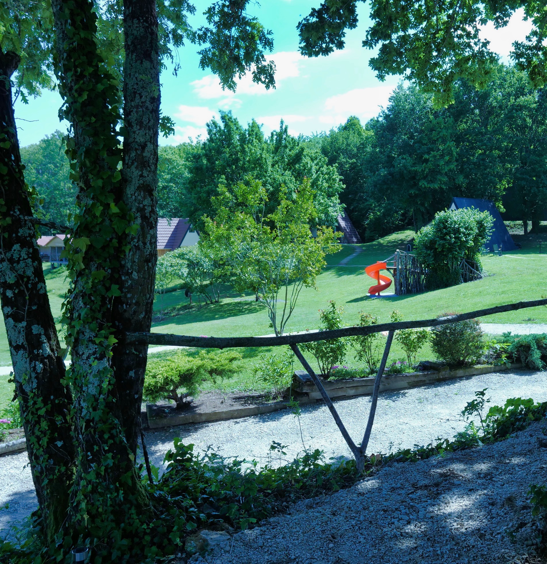 Vanuit elke lodge is een goed overzicht van het park. Je verliest de kinderen nooit uit het zicht.